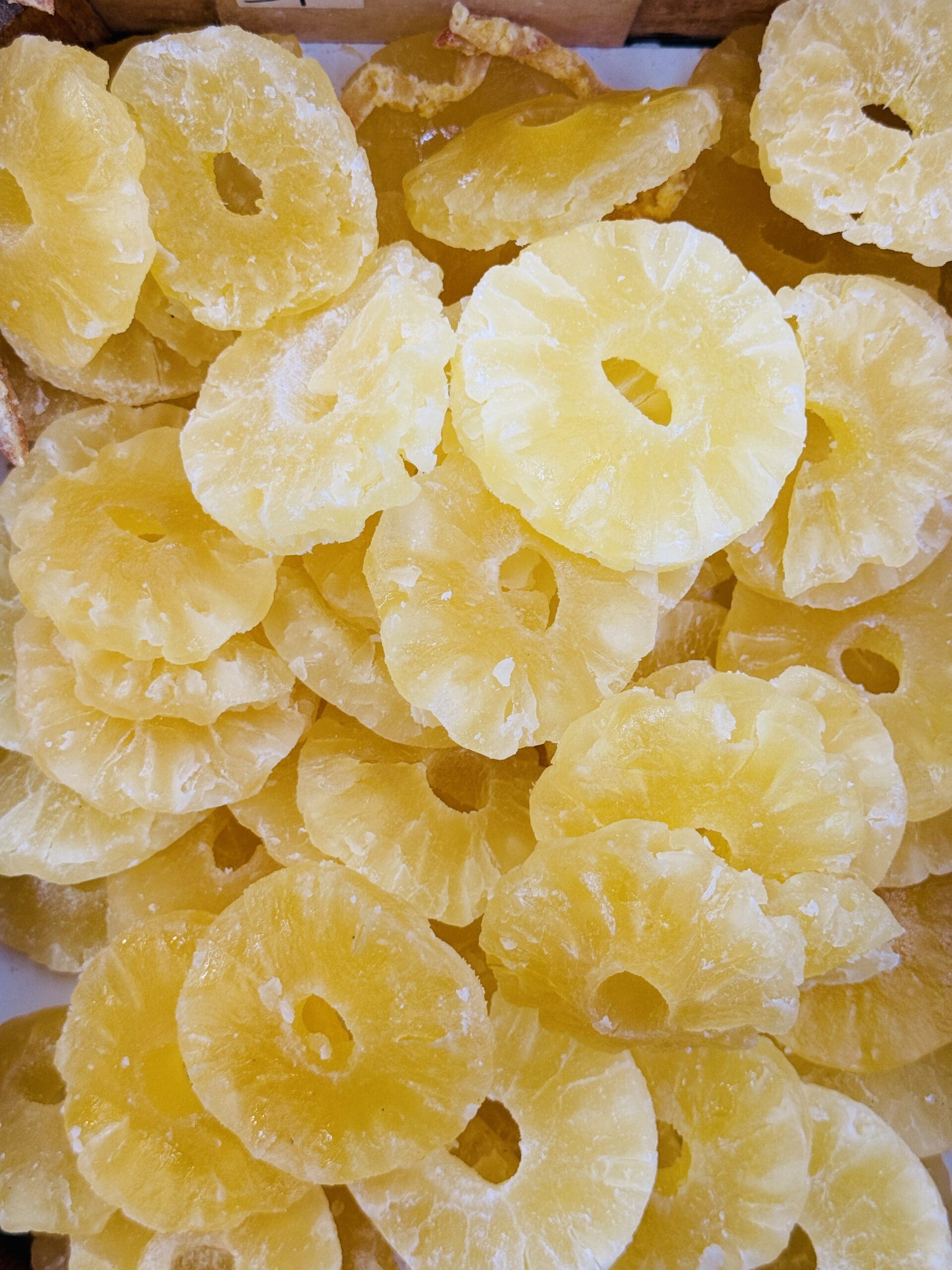 אננס מיובש בעל מתיקות טבעית וניחוח טרופי. מתאים לנשנוש, קינוחים ועוגות. מחיר ל-100 גרם: 4₪