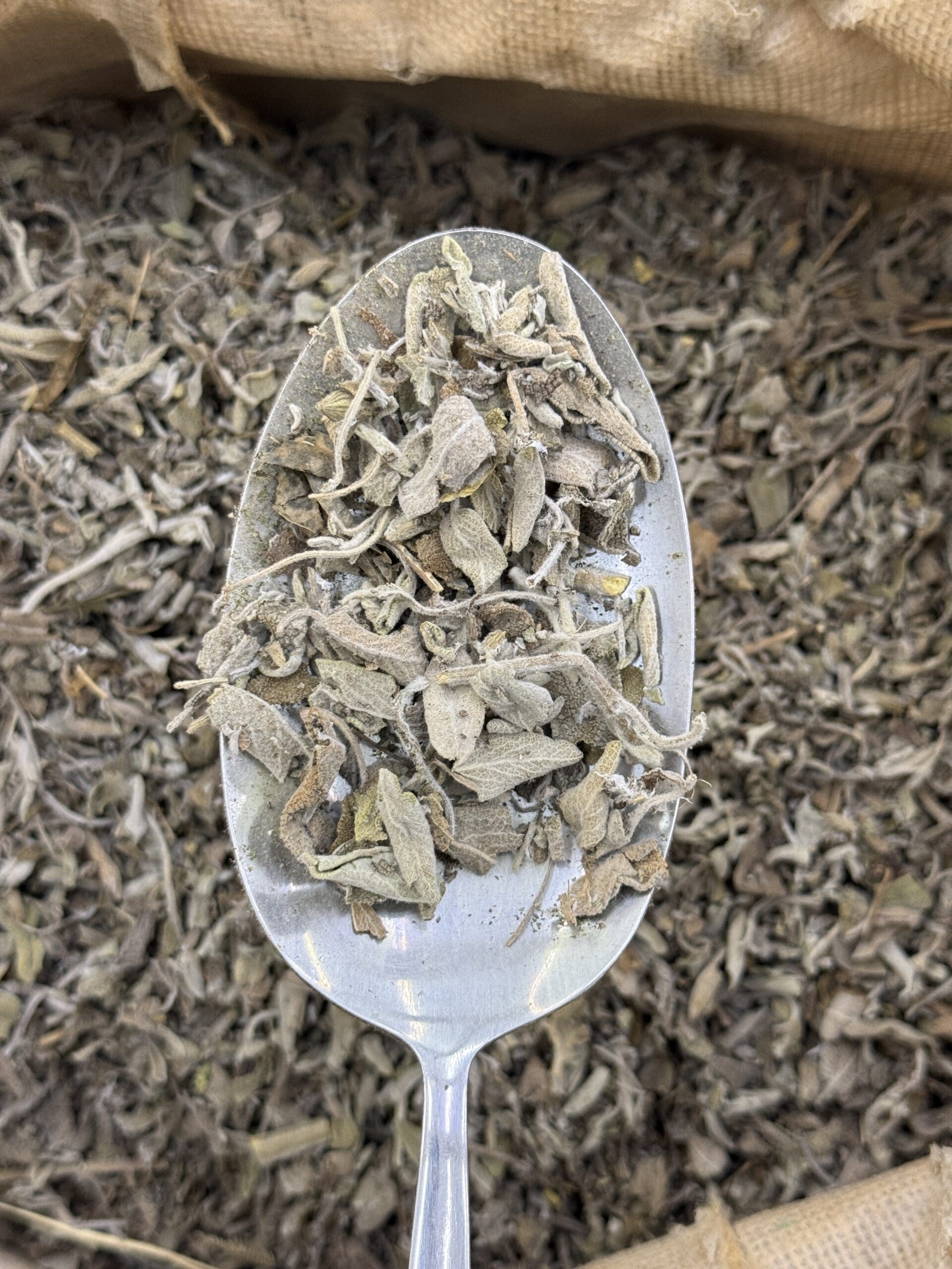 עלי מרווה מיובשים לחליטה עם טעם צמחי מודגש וארומה אופיינית. מחיר ל-100 גרם: 12₪